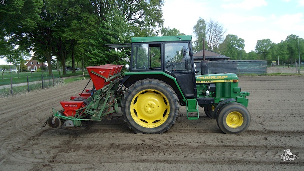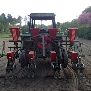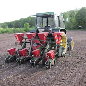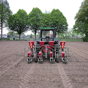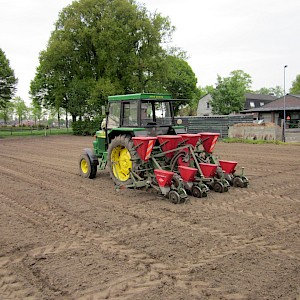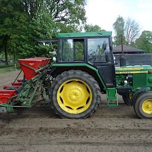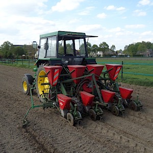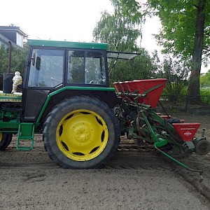 Voorzien van doseerbare kunstmestbakken, verstelbare zaai-elementen en markeurs, ha teller,
