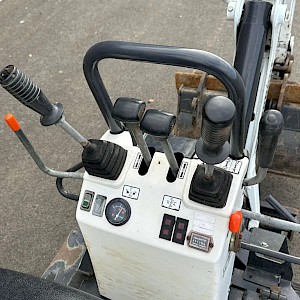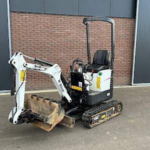 Bobcat E08 minikraan, bouwjaar 2008, uren 2023, 3-cilinder, 10 pk, 1.138 kg, hydraulisch verstelbare onderwagen (71 cm-100cm), maximale graafdiepte circa 1,82 meter, 3 bakken.