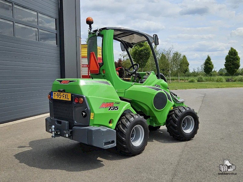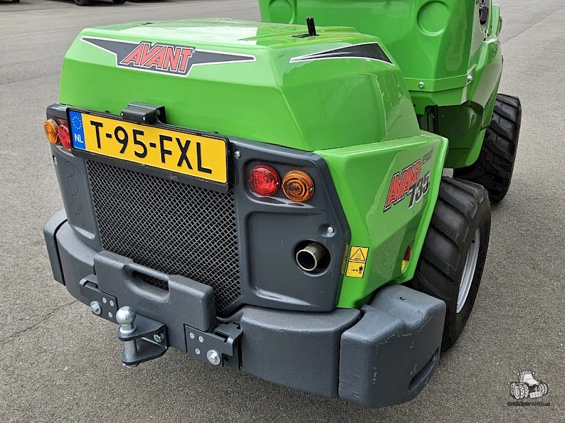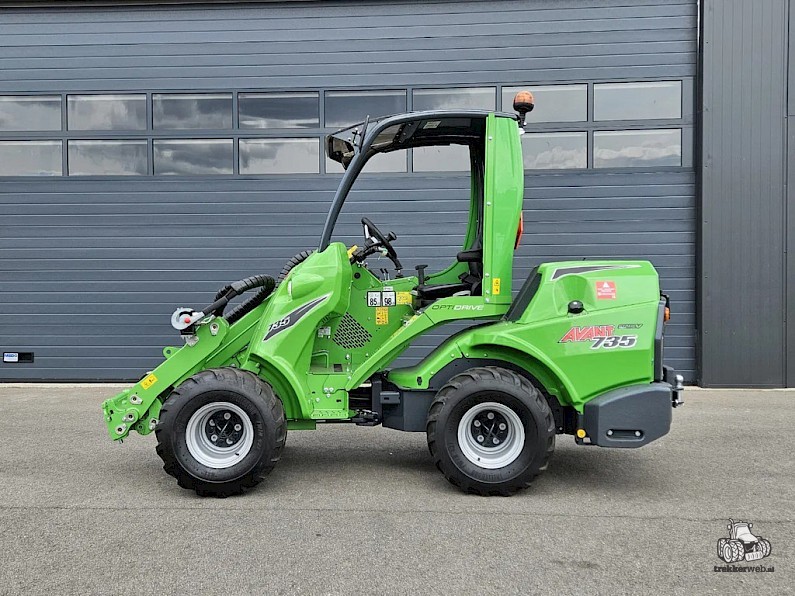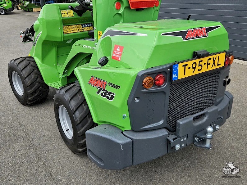Nieuwe Avant 735 TDL+ mini-shovel, Bouwjaar 2023, Hefvermogen 1400 kg, Motorvermogen 26 hp diesel Stage V, Snelheid 12 km/h, Hefhoogte 3.1 m, Gewicht 1810 kg, TDL+ pakket: Wegverlichtingskit, Hydr. snelwisselsysteem, Led-werklichtenkit, Zijgewichten 2 x 90kg, 320/60-12 Banden (129,5 cm breed).