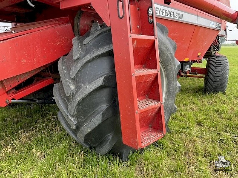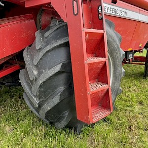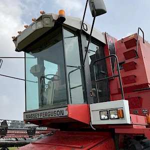 Gebruikte Massey Ferguson 38RS combine + maaibord met bouwjaar 1993. Met 2.674 werkuren en een spoorbreedte van 2.980 mm. Heeft groot onderhoud gehad.