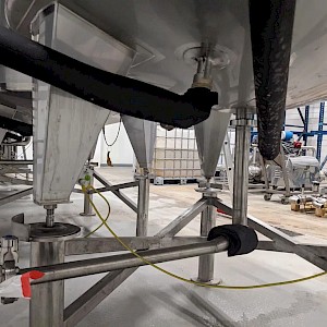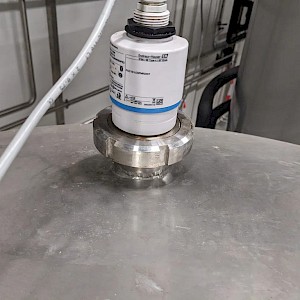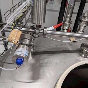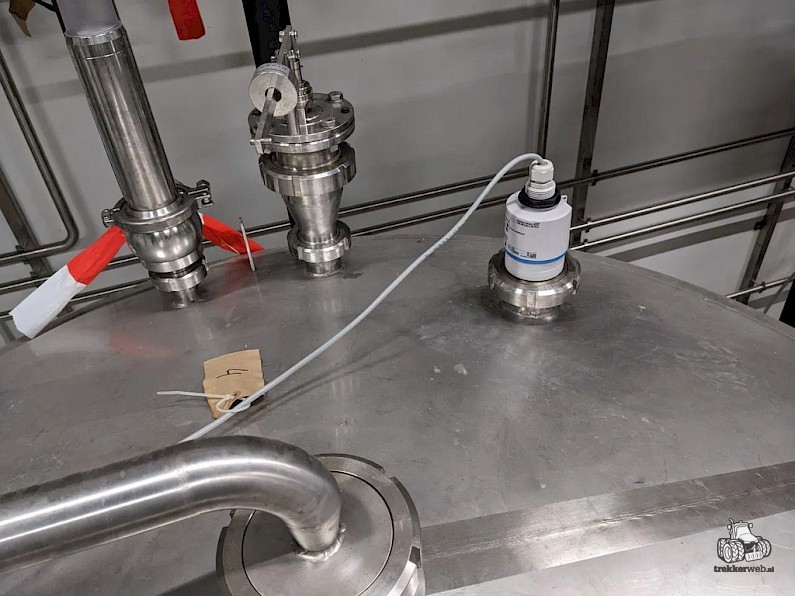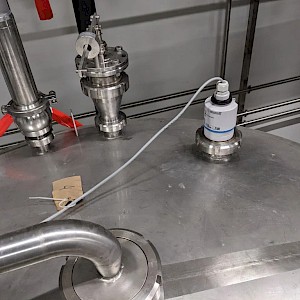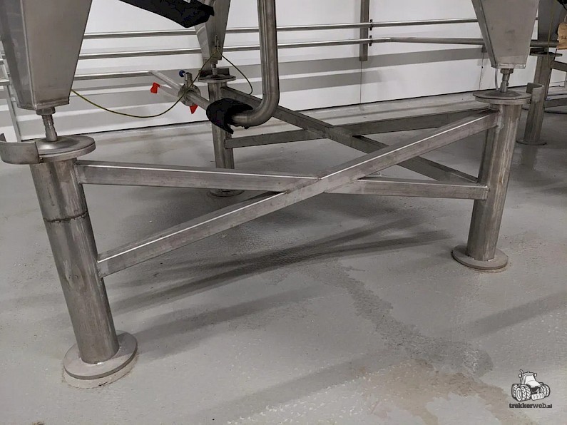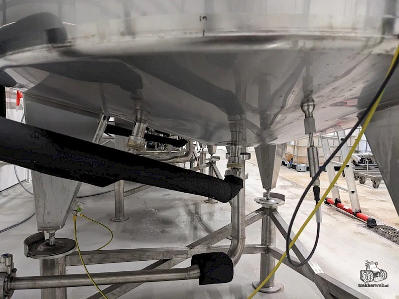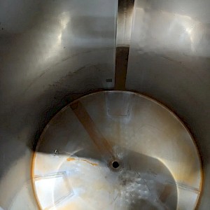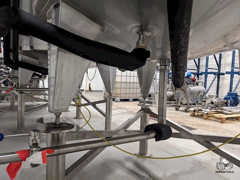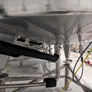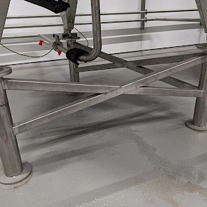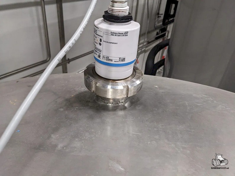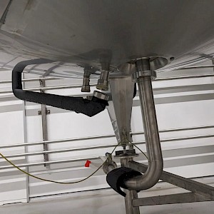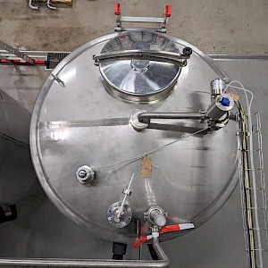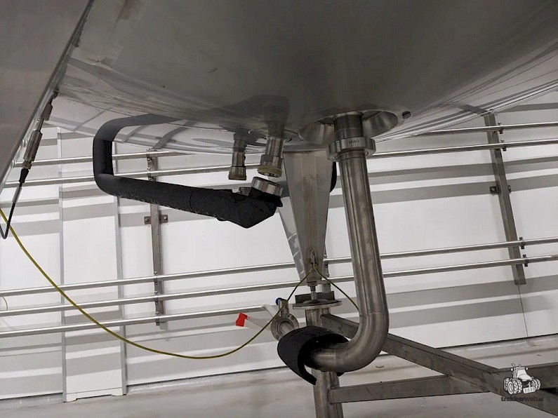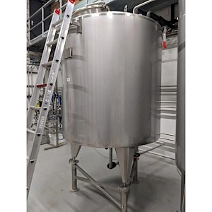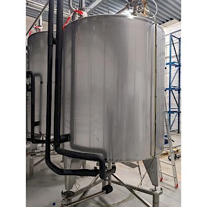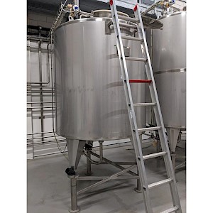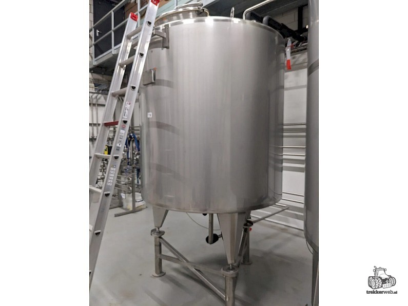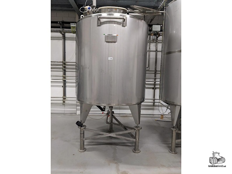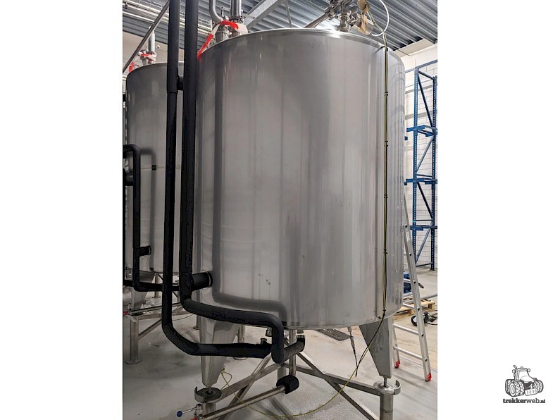 Koeltank op 3 steunpoten en onderstel van 50cm, uitgevoerd met mangat, instrumenten: onder en overdrukbeveiliging, sproeibol, 2 pneumatische afsluiters, aftapleiding, met circa koelleiding met afsluiters, elektronische inhoudsmeting met E+H, PT100 sensor, met alu ladder